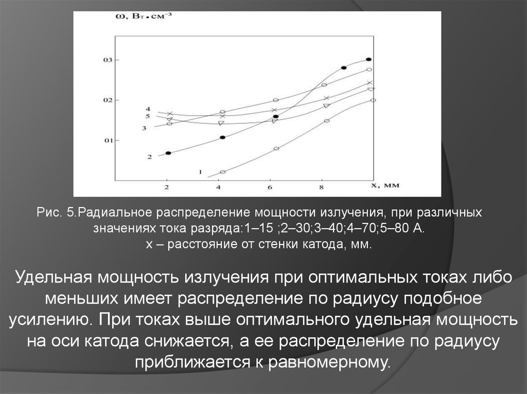 Рис. 5.Радиальное распределение мощности излучения, при различныхзначениях тока разряда:1–15 ;2–30;3–40;4–70;5–80 А.