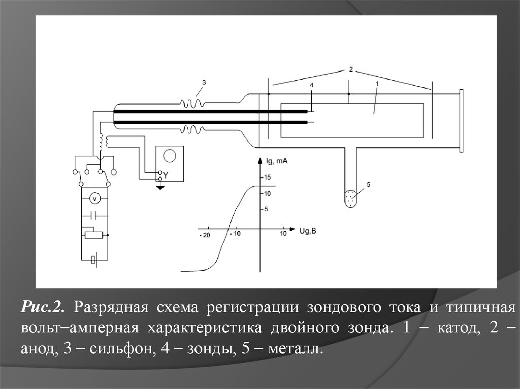 Рис.2. Разрядная схема регистрации зондового тока и типичнаявольт–амперная характеристика двойного зонда. 1 – катод, 2 –