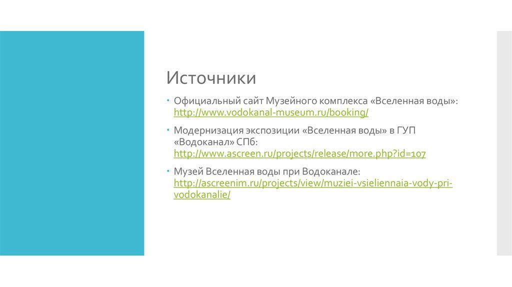 ИсточникиОфициальный сайт Музейного комплекса «Вселенная воды»: