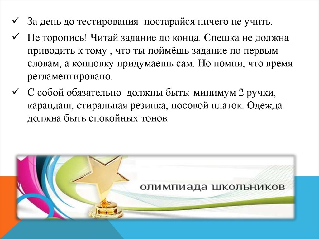 За день до тестирования постарайся ничего не учить.Не торопись! Читай задание до конца. Спешка не должна