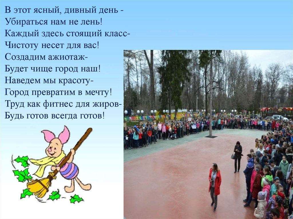 В этот ясный, дивный день Убираться нам не лень!Каждый здесь стоящий классЧистоту несет для вас!