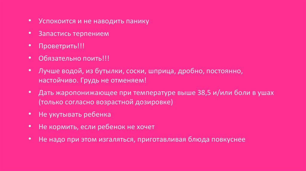 • Дать жаропонижающее при температуре выше 38,5 и/или боли в ушах