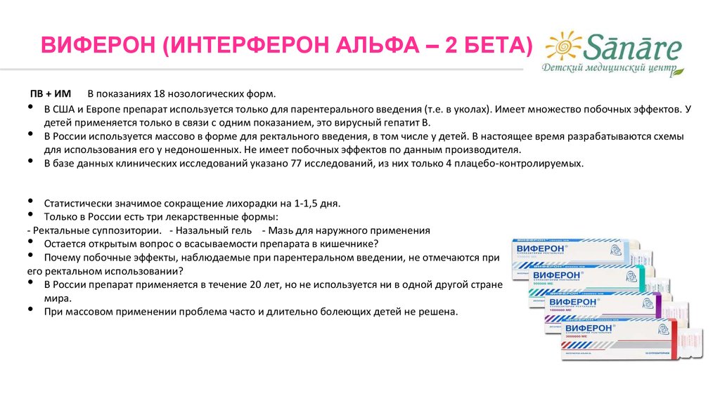 ВИФЕРОН (ИНТЕРФЕРОН АЛЬФА – 2 БЕТА)ПВ + ИМ В показаниях 18 нозологических форм.