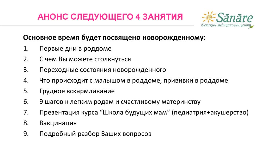 АНОНС СЛЕДУЮЩЕГО 4 ЗАНЯТИЯОсновное время будет посвящено новорожденному: