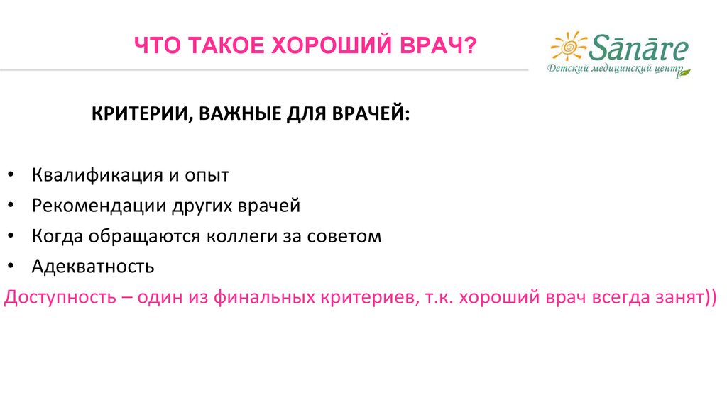 Доступность – один из финальных критериев, т.к. хороший врач всегда занят))