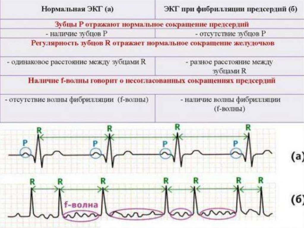 Фибрилляция предсердий (ФП) характеризуется абсолютнонерегулярным ритмом желудочков и отсутствием зубцов Р. Она