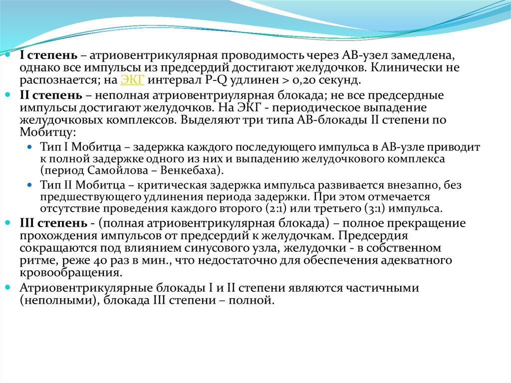 I степень – атриовентрикулярная проводимость через АВ-узел замедлена,однако все импульсы из предсердий достигают желудочков. Клинически не