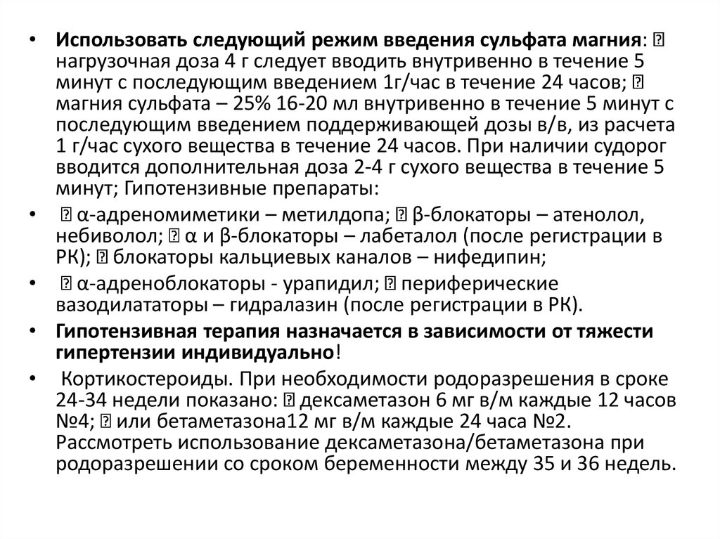 • Использовать следующий режим введения сульфата магния:нагрузочная доза 4 г следует вводить внутривенно в течение 5