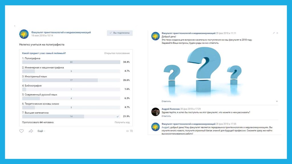 В группе размещались различные опросы,создавались темы для абитуриентов. Были