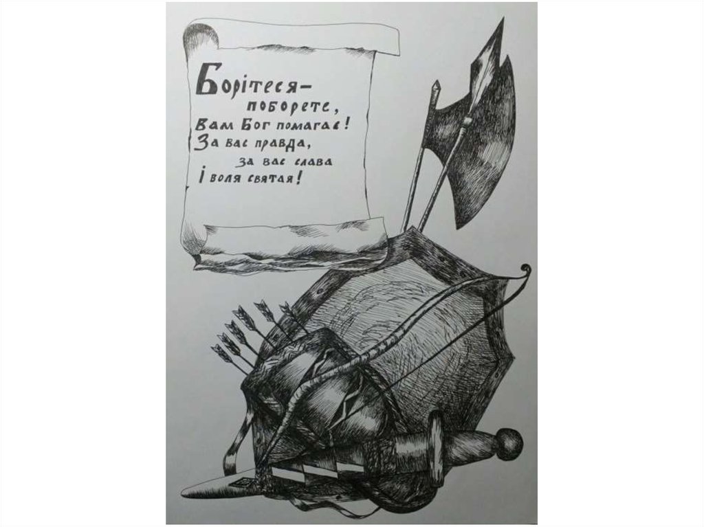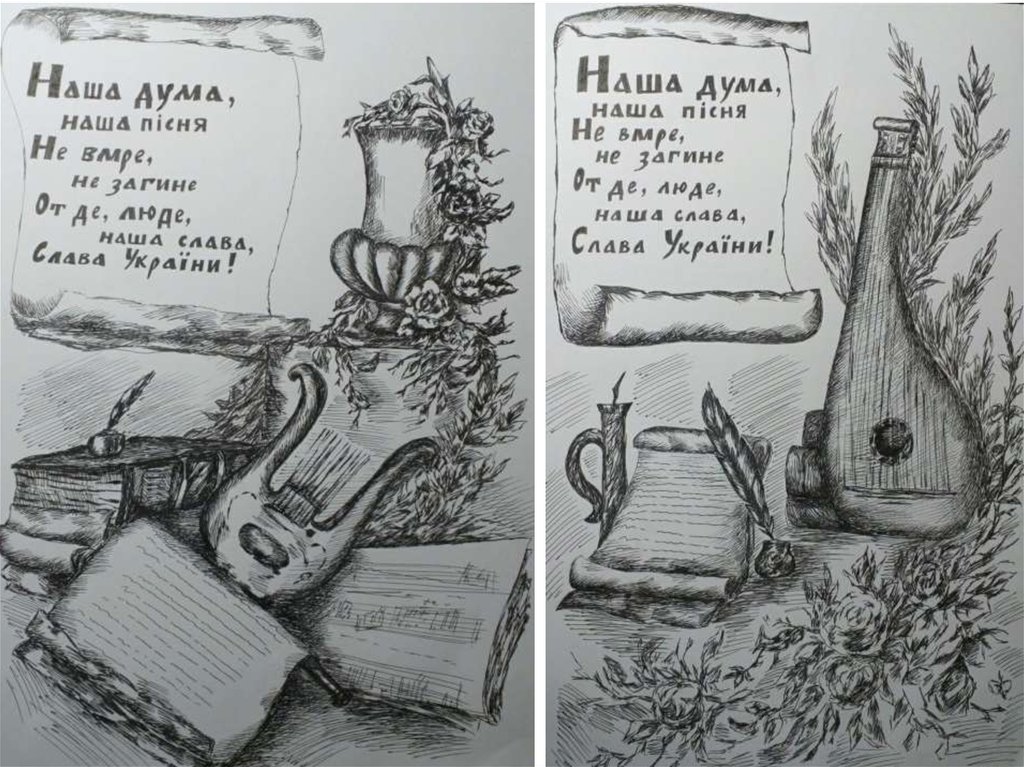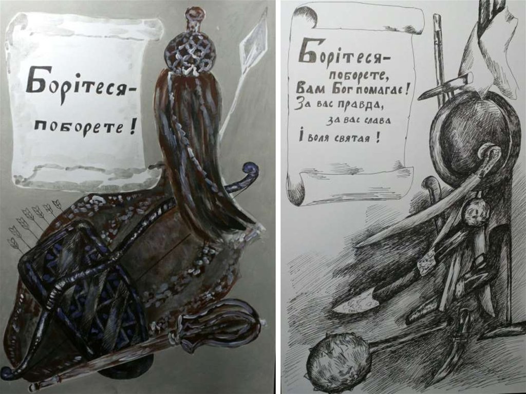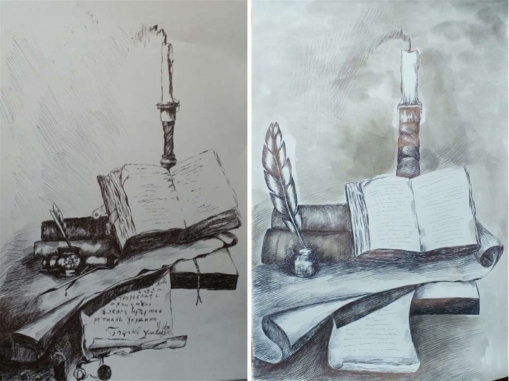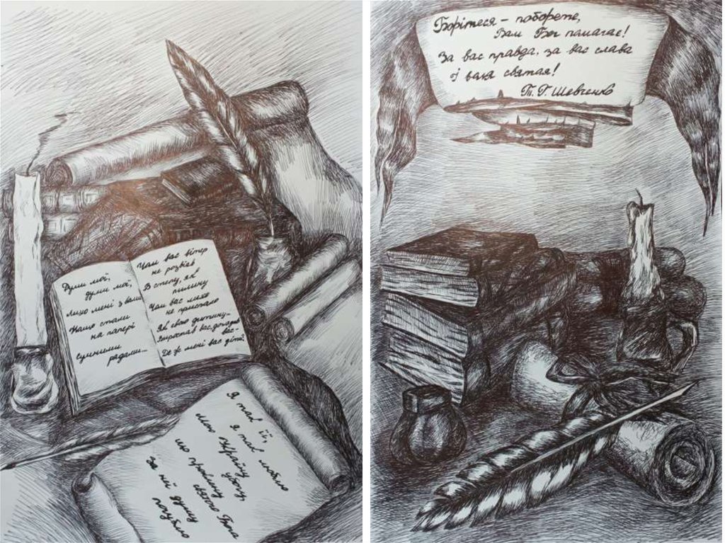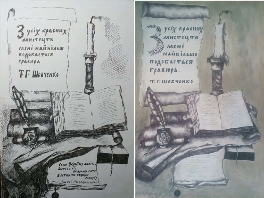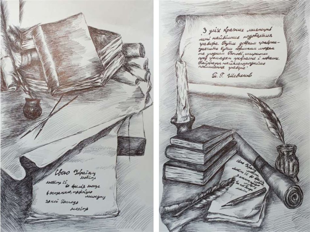 Пошукова робота над триптихом у змішаній техніці за мотивами творчості Т.Г. Шевченко (вологий соус, туш-перо, кулькова ручка)