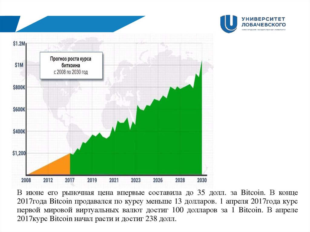 В июне его рыночная цена впервые составила до 35 долл. за Bitcoin. В конце2017года Bitcoin продавался по курсу меньше 13 долларов. 1 апреля 2017года курс