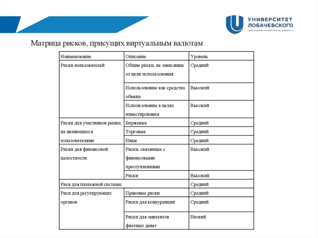 Матрица рисков, присущих виртуальным валютамНаименование