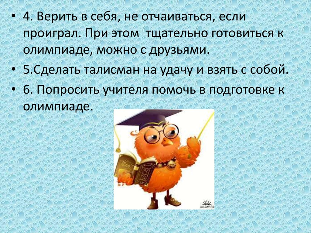 • 1. Не стоит вечером перед олимпиадой многорешать заданий, чтобы не перетрудиться.