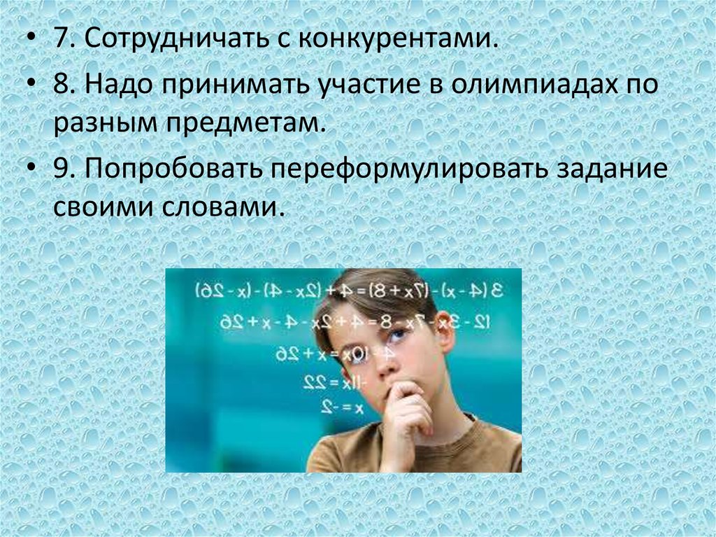 • 7. Сотрудничать с конкурентами.• 8. Надо принимать участие в олимпиадах по