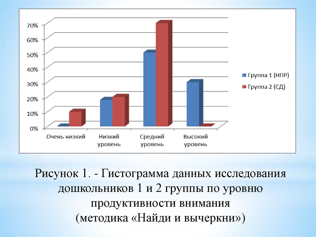 Рисунок 1. - Гистограмма данных исследованиядошкольников 1 и 2 группы по уровню