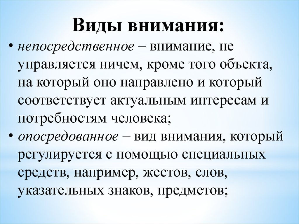 Виды внимания:• непосредственное – внимание, не