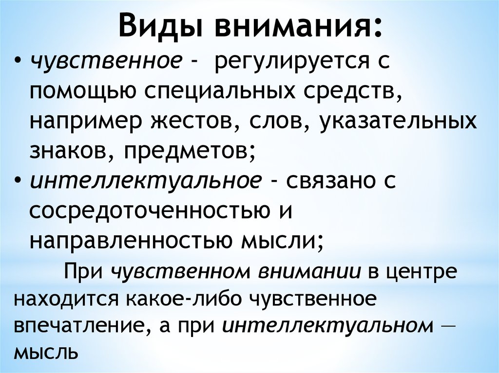 Виды внимания:• чувственное - регулируется с