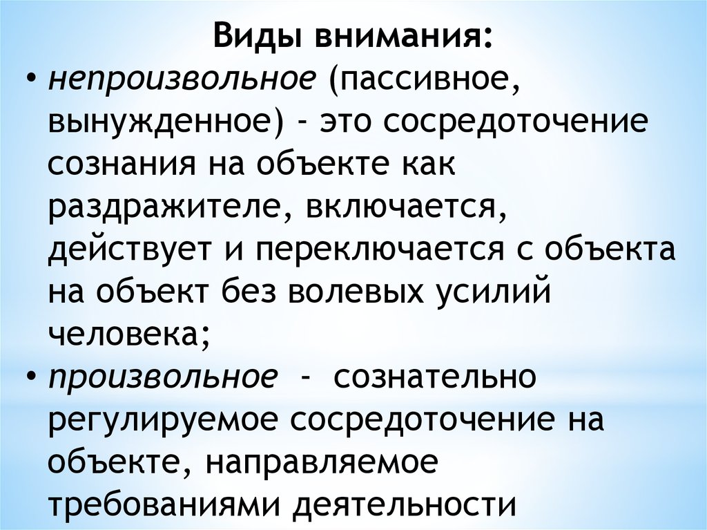 Виды внимания:• непроизвольное (пассивное,