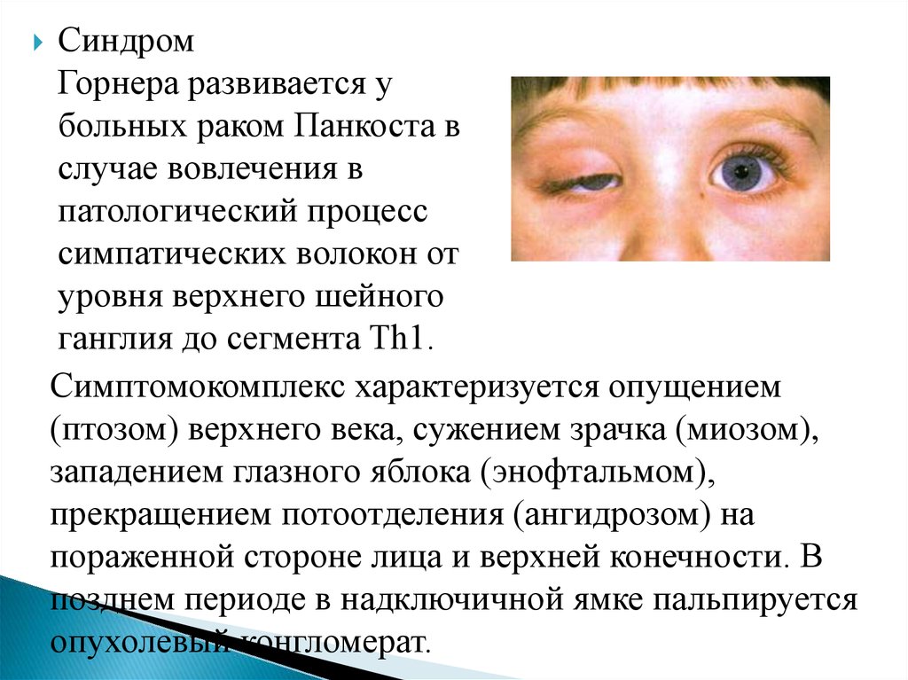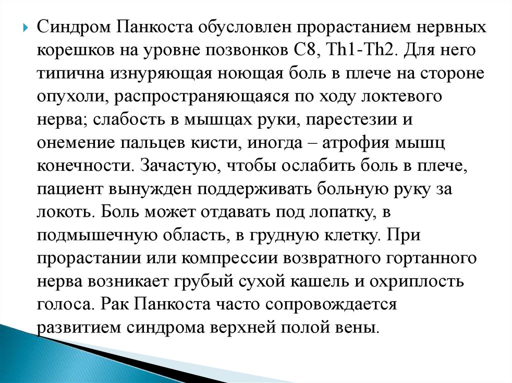Синдром Панкоста обусловлен прорастанием нервныхкорешков на уровне позвонков С8, Th1-Th2. Для него