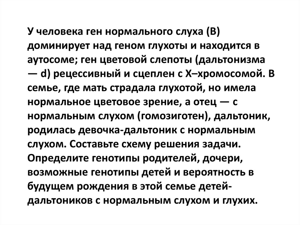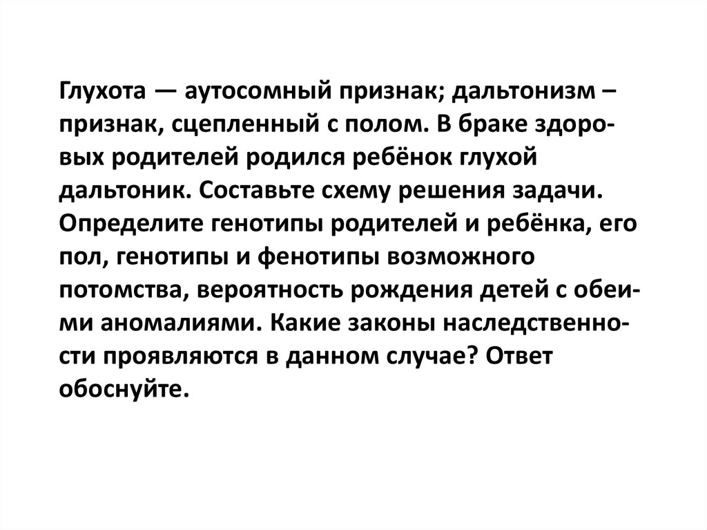Глухота — аутосомный признак; дальтонизм –признак, сцепленный с полом. В браке здоровых родителей родился ребёнок глухой