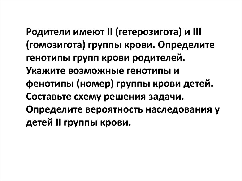 Родители имеют II (гетерозигота) и III(гомозигота) группы крови. Определите