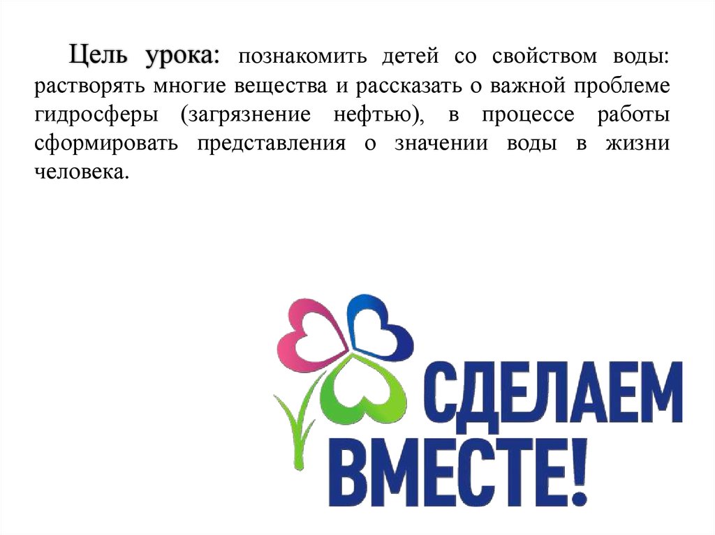 Цель урока: познакомить детей со свойством воды:растворять многие вещества и рассказать о важной проблеме