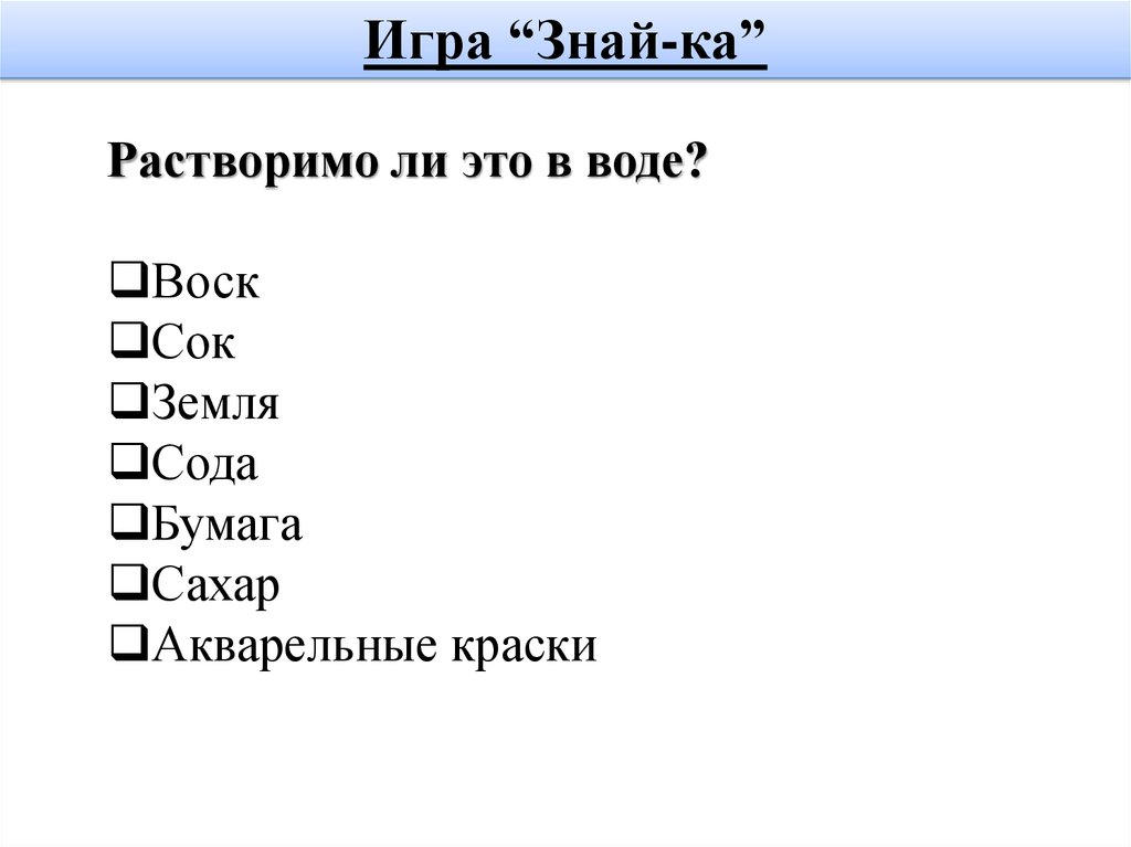 Игра “Знай-ка”Растворимо ли это в воде?