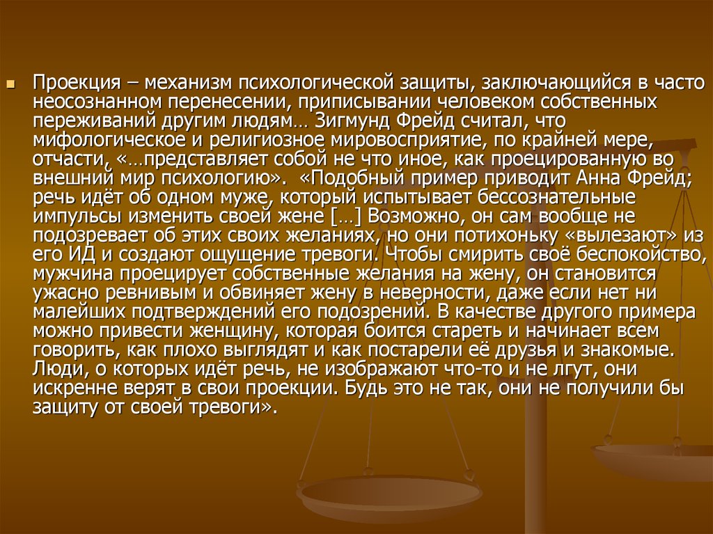 Проекция – механизм психологической защиты, заключающийся в частонеосознанном перенесении, приписывании человеком собственных