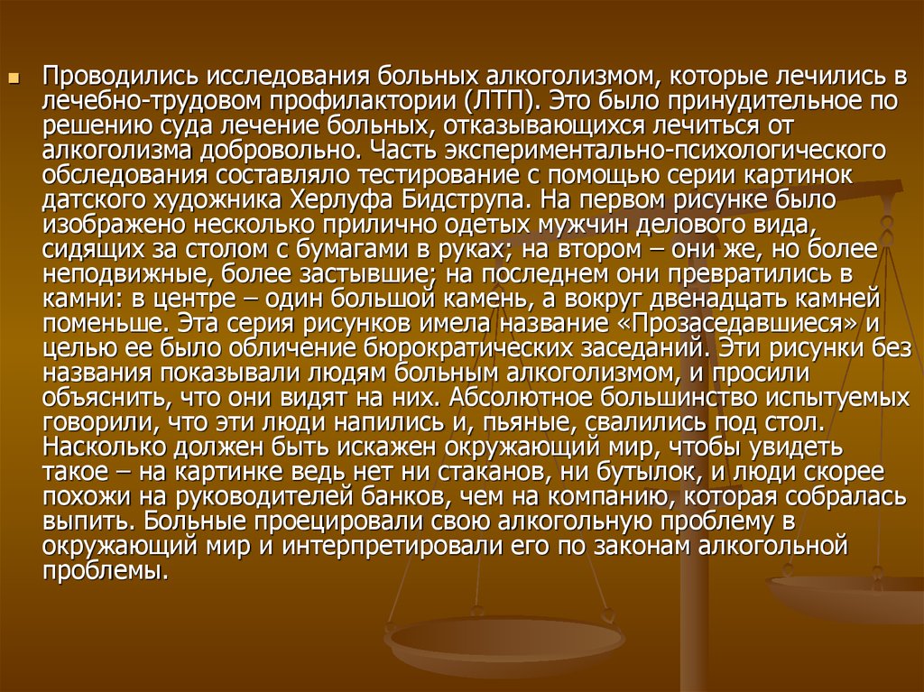 Проводились исследования больных алкоголизмом, которые лечились влечебно-трудовом профилактории (ЛТП). Это было принудительное по
