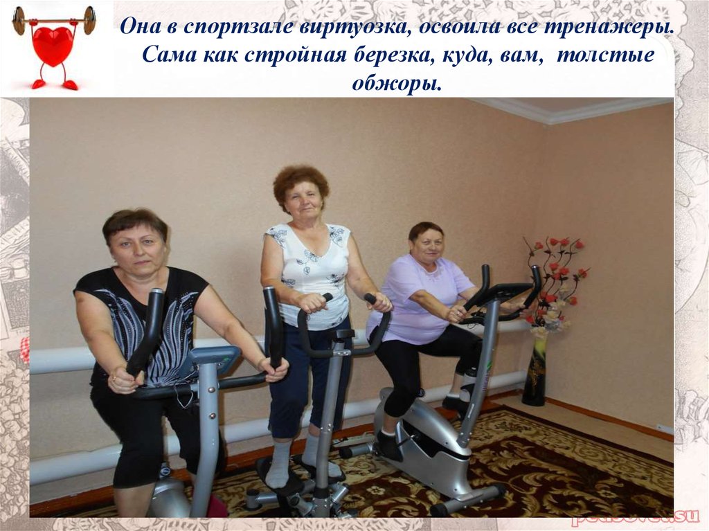 Она в спортзале виртуозка, освоила все тренажеры.Сама как стройная березка, куда, вам, толстые