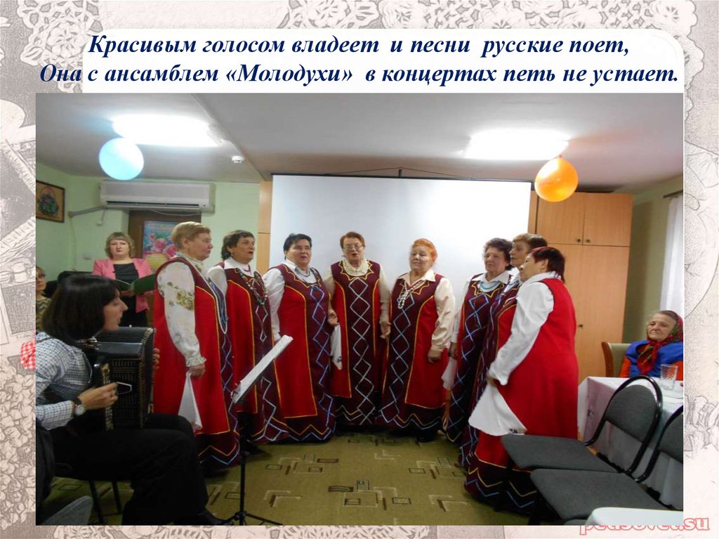 Красивым голосом владеет и песни русские поет,Она с ансамблем «Молодухи» в концертах петь не устает.