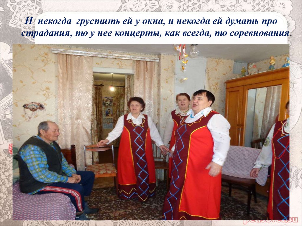 И некогда грустить ей у окна, и некогда ей думать прострадания, то у нее концерты, как всегда, то соревнования.