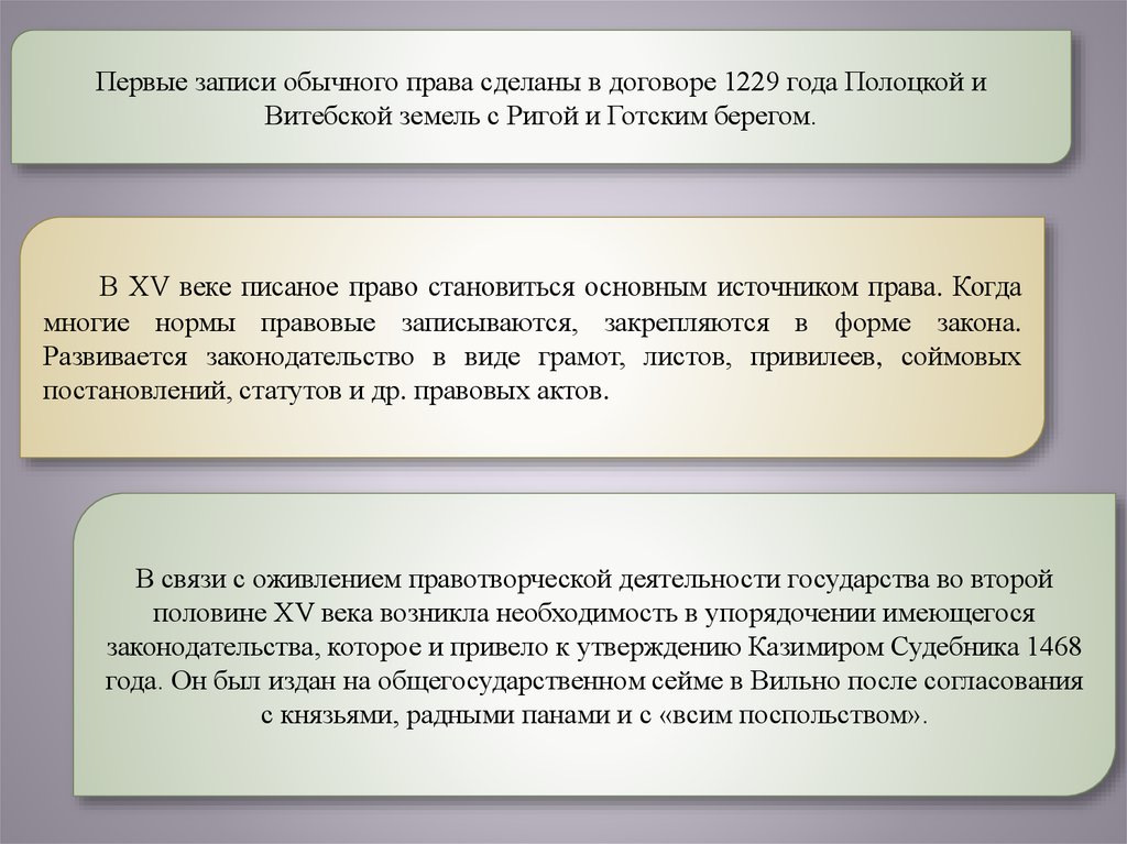 Первые записи обычного права сделаны в договоре 1229 года Полоцкой иВитебской земель с Ригой и Готским берегом.