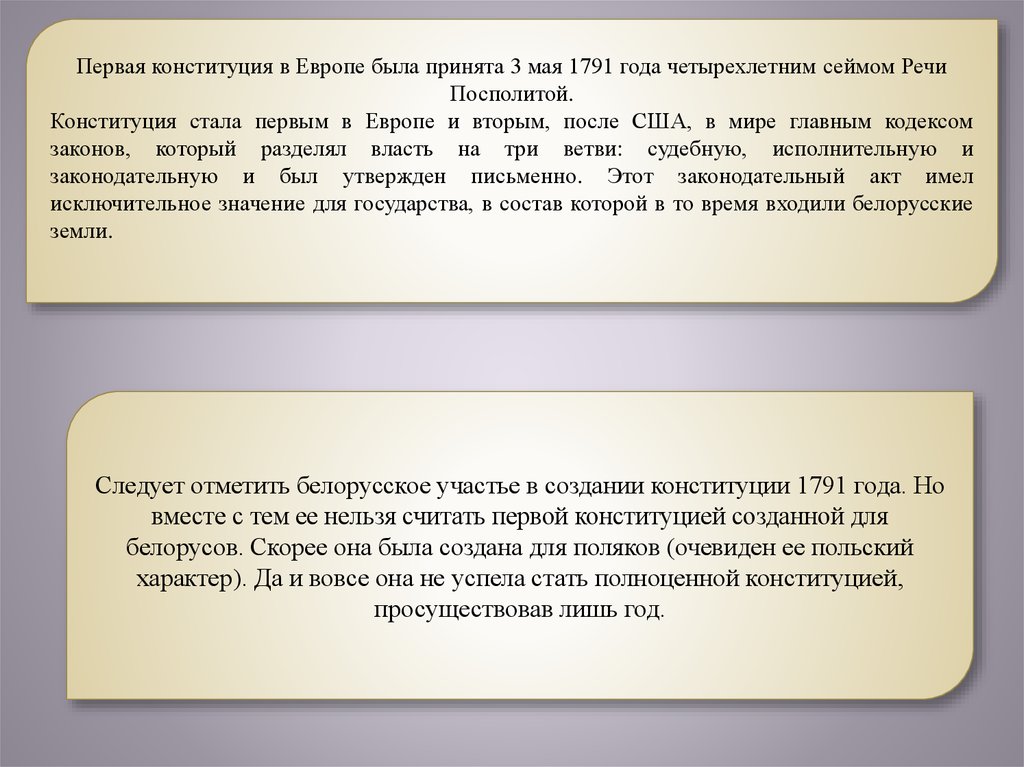 Первая конституция в Европе была принята 3 мая 1791 года четырехлетним сеймом РечиПосполитой.