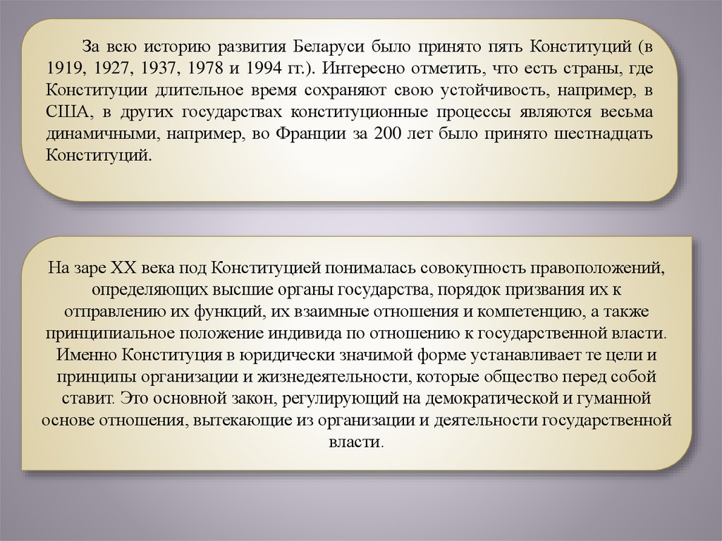 За всю историю развития Беларуси было принято пять Конституций (в1919, 1927, 1937, 1978 и 1994 гг.). Интересно отметить, что есть страны, где