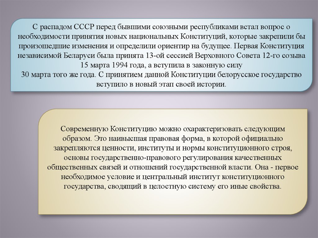 С распадом СССР перед бывшими союзными республиками встал вопрос онеобходимости принятия новых национальных Конституций, которые закрепили бы