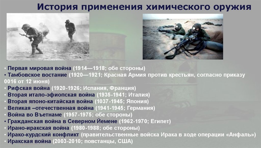 История применения химического оружия• Первая мировая война (1914—1918; обе стороны)