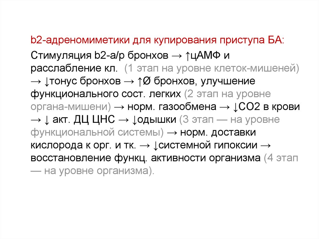 b2-адреномиметики для купирования приступа БА:Стимуляция b2-а/р бронхов → ↑цАМФ и