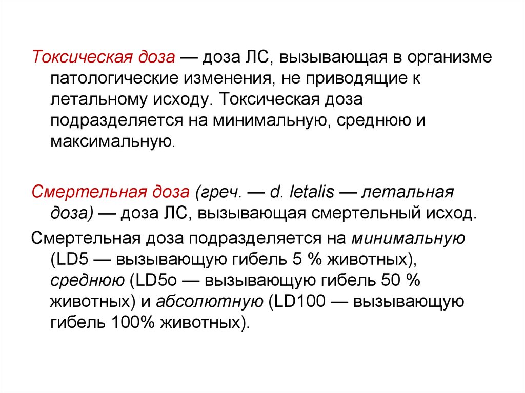Токсическая доза — доза ЛС, вызывающая в организмепатологические изменения, не приводящие к