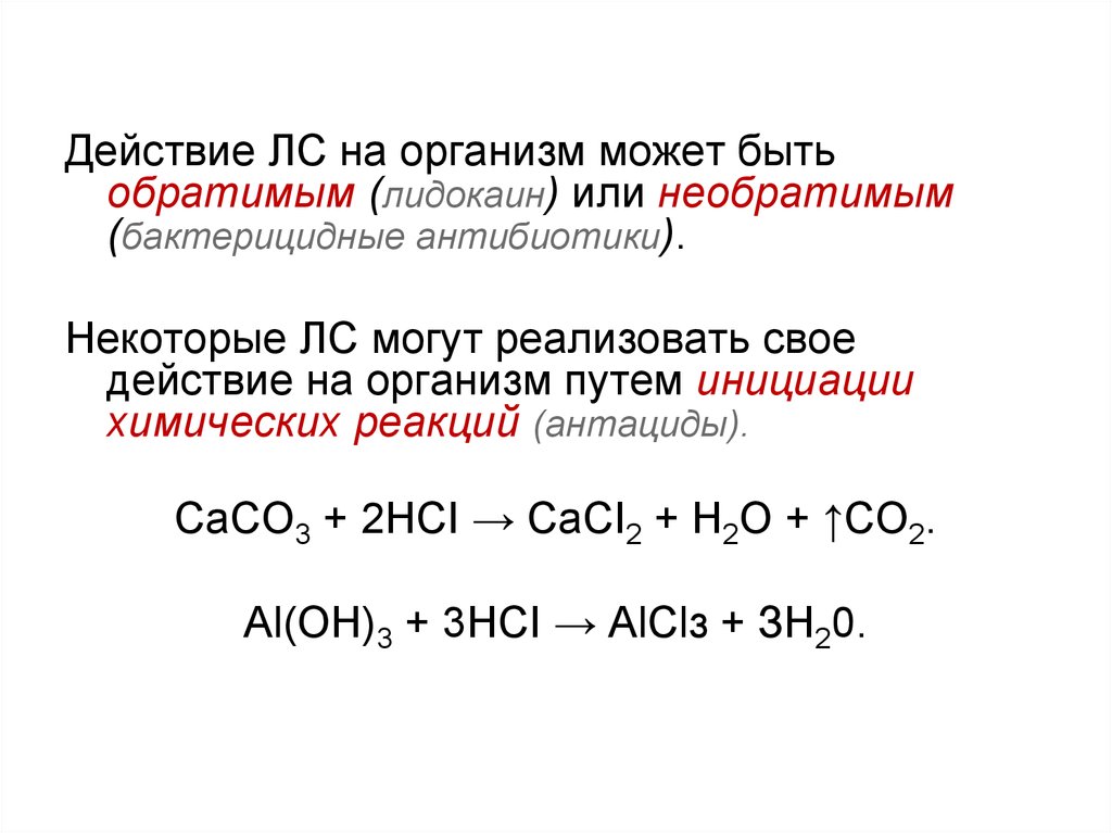 Действие ЛС на организм может бытьобратимым (лидокаин) или необратимым