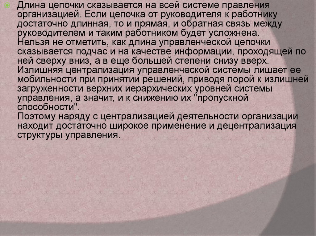 Длина цепочки сказывается на всей системе правленияорганизацией. Если цепочка от руководителя к работнику