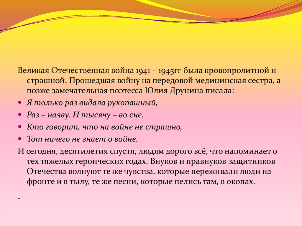 Великая Отечественная война 1941 – 1945гг была кровопролитной истрашной. Прошедшая войну на передовой медицинская сестра, а
