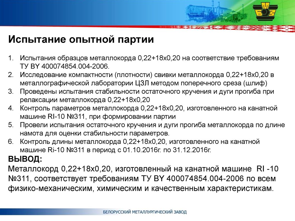 Испытание опытной партии1. Испытания образцов металлокорда 0,22+18х0,20 на соответствие требованиям