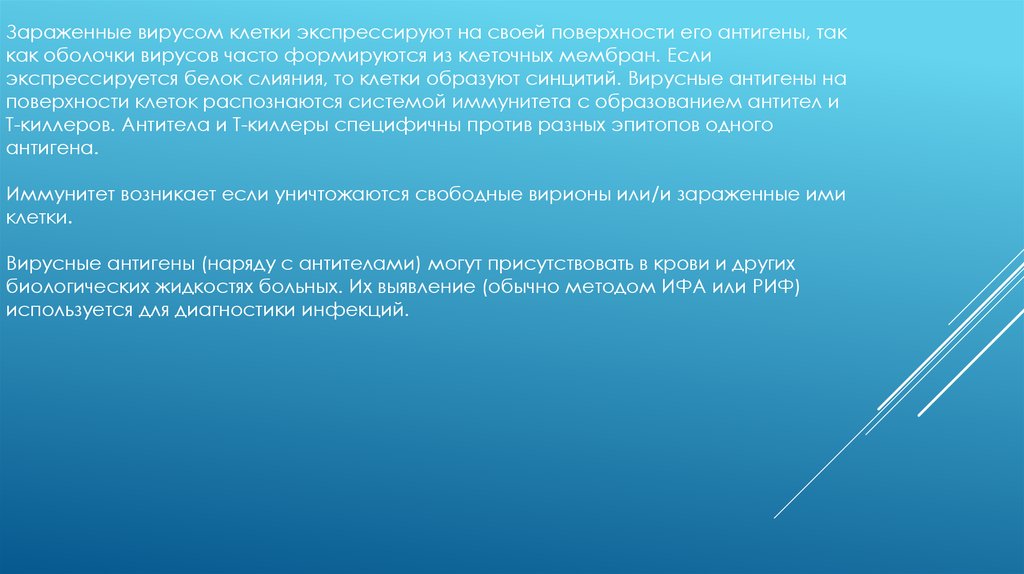 Зараженные вирусом клетки экспрессируют на своей поверхности его антигены, таккак оболочки вирусов часто формируются из клеточных мембран. Если
