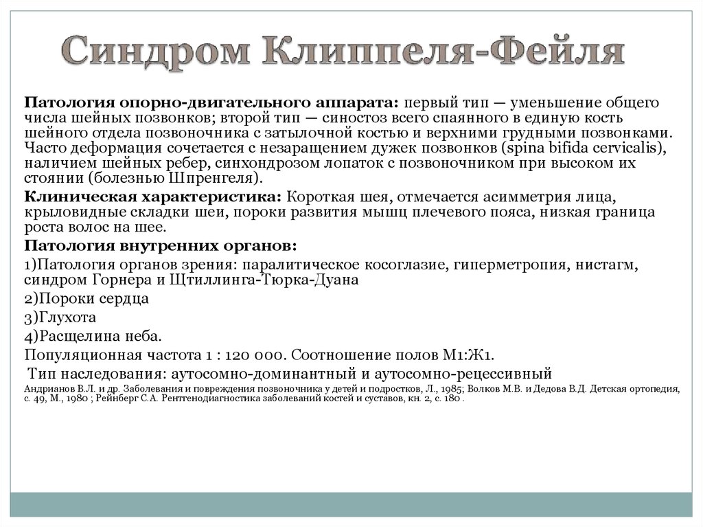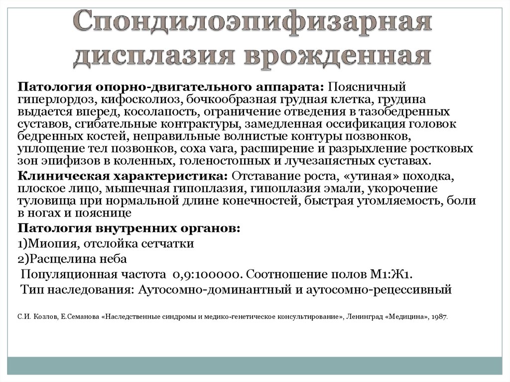 С.И. Козлов, Е.Семанова «Наследственные синдромы и медико-генетическое консультирование», Ленинград «Медицина», 1987.
