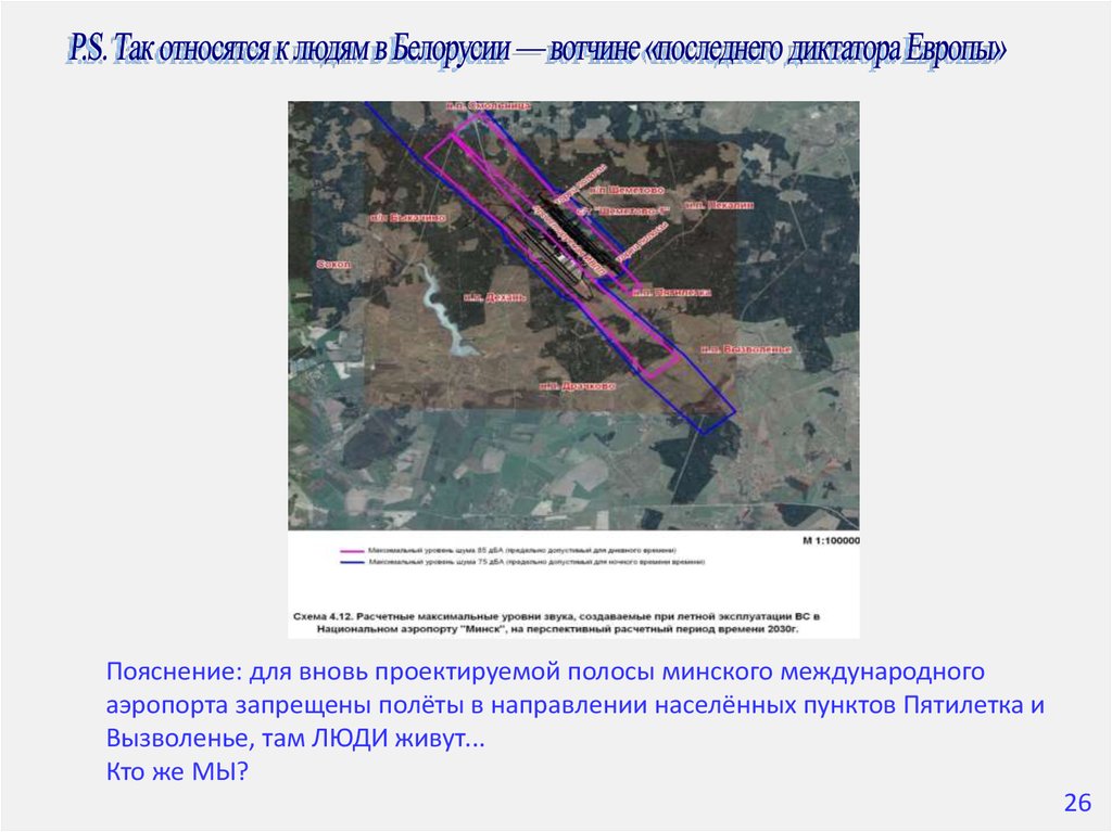 Пояснение: для вновь проектируемой полосы минского международногоаэропорта запрещены полёты в направлении населённых пунктов Пятилетка и
