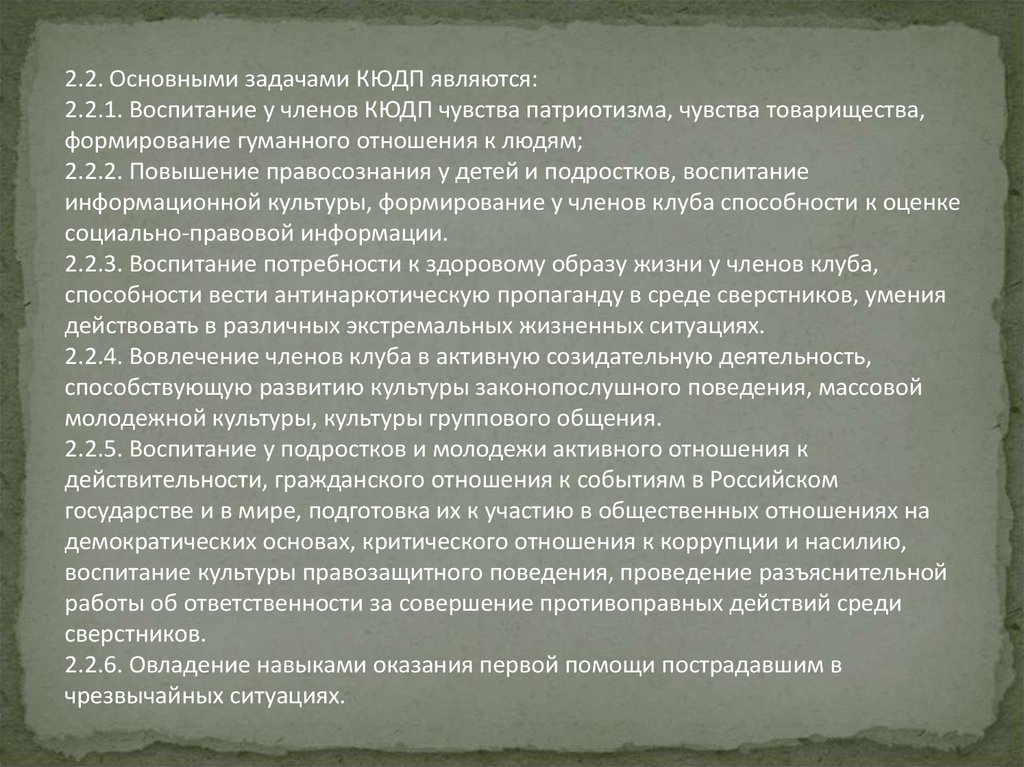 2.2. Основными задачами КЮДП являются:2.2.1. Воспитание у членов КЮДП чувства патриотизма, чувства товарищества,
