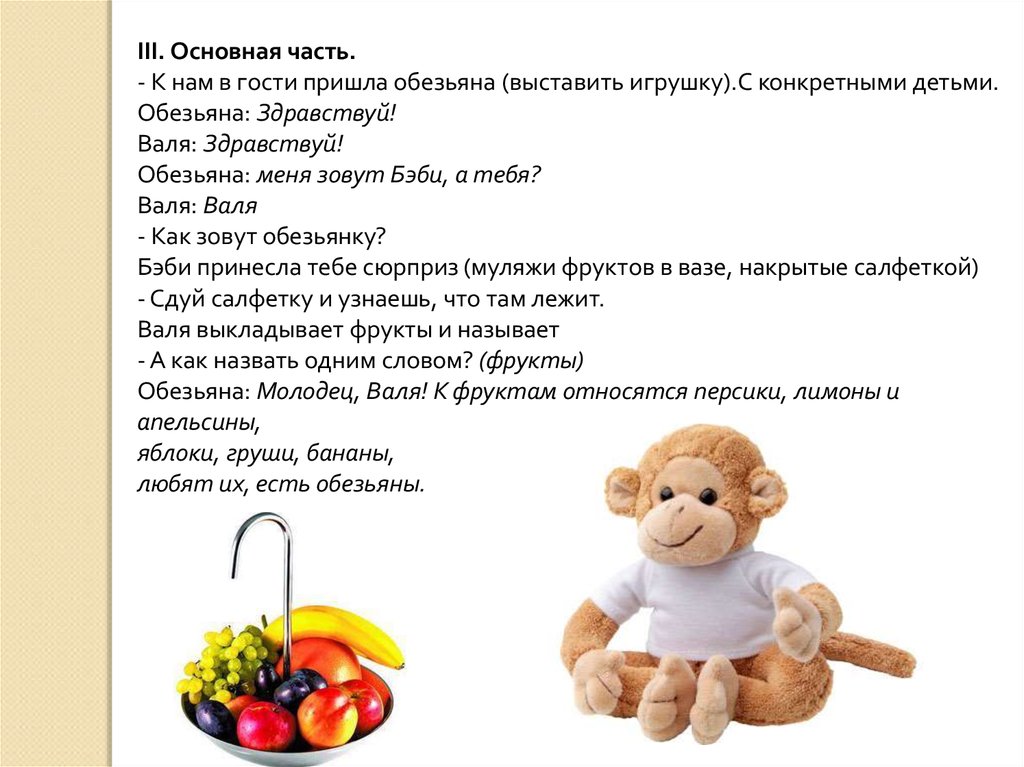 III. Основная часть.- К нам в гости пришла обезьяна (выставить игрушку).С конкретными детьми.