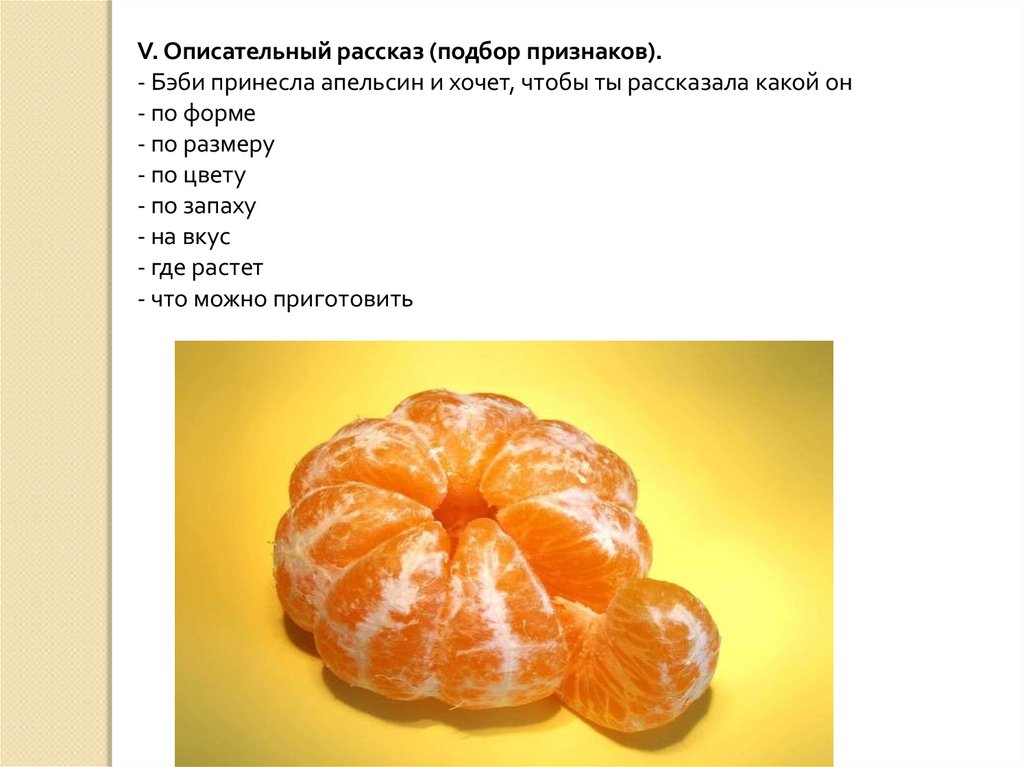 V. Описательный рассказ (подбор признаков).- Бэби принесла апельсин и хочет, чтобы ты рассказала какой он