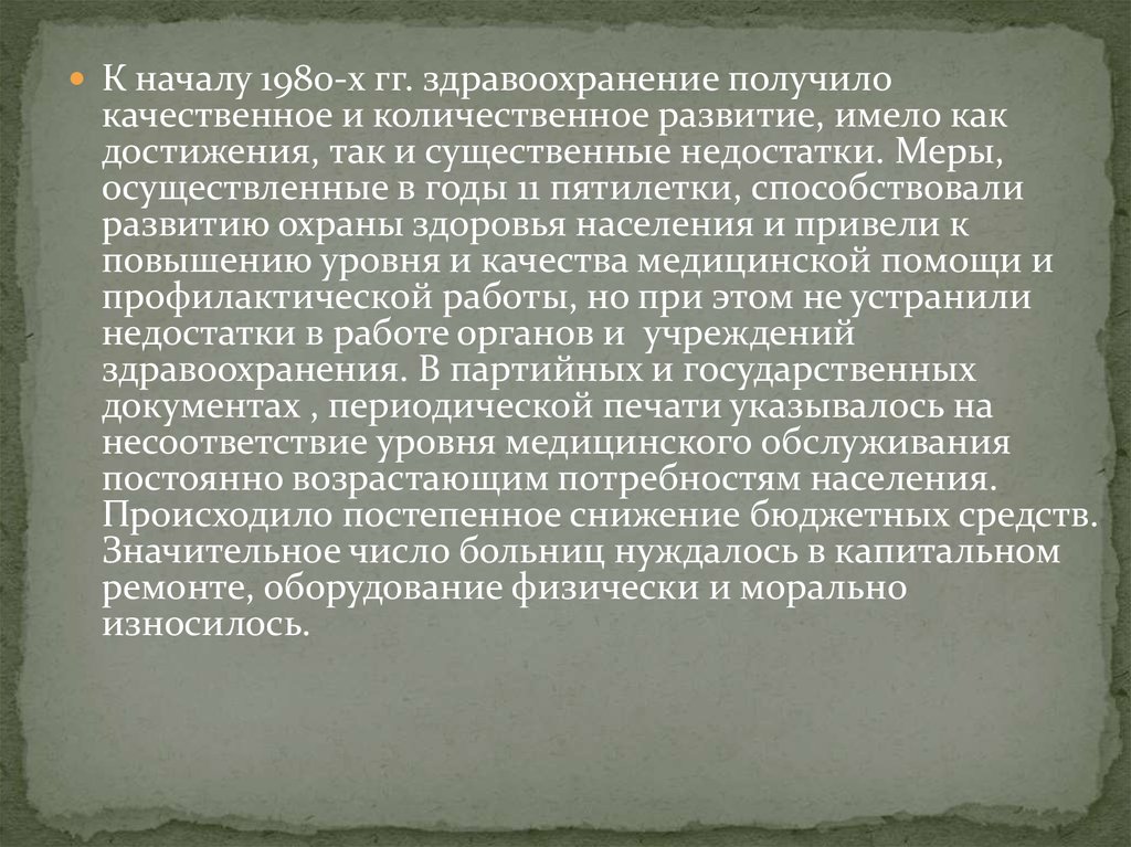 К началу 1980-х гг. здравоохранение получилокачественное и количественное развитие, имело как